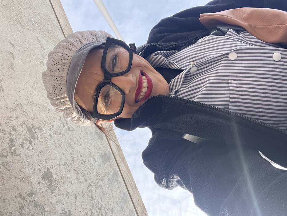 A female individual is depicted in an upward-angled, close-up selfie, presumably taken in Mensdorf, Luxembourg. She is smiling broadly, exposing teeth, and wears bright red lipstick with a small dark mark above her upper right lip. Her face is framed by large, dark-colored, geometric eyeglasses. She wears a light-colored, perforated cap with a darker brim. Her outerwear is a black zippered fleece jacket, beneath which a white shirt with vertical dark stripes and white buttons is visible. A partially visible green-and-white tag or badge is attached to the left side of her jacket. A light brown, leather-like object, possibly a bag, is visible on the right side of the frame, held by the individual. The background consists of a rough, light-colored concrete-like overhang in the upper left, transitioning to a bright blue sky with some white clouds in the upper right and mid-left, indicating an outdoor, daytime environment.
