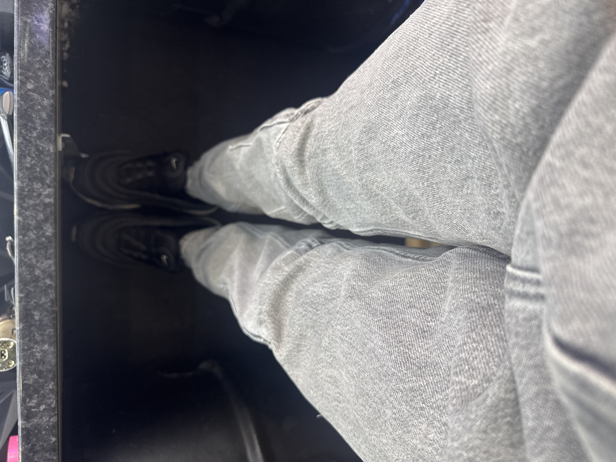 The image displays a low, first-person perspective view of an individual's lower body within an interior setting. The subject wears light gray denim jeans, characterized by visible fabric texture and folds, and black athletic-style sneakers. Their legs are extended forward into a dark, confined space, appearing to be a footwell or compartment. Immediately above this space, the underside of a dark, speckled counter-like surface is visible. On the top surface of this counter, a set of keys and other metallic objects are partially discernible. The precise location within the city of Unknown, Unknown, cannot be determined from the visual evidence presented.