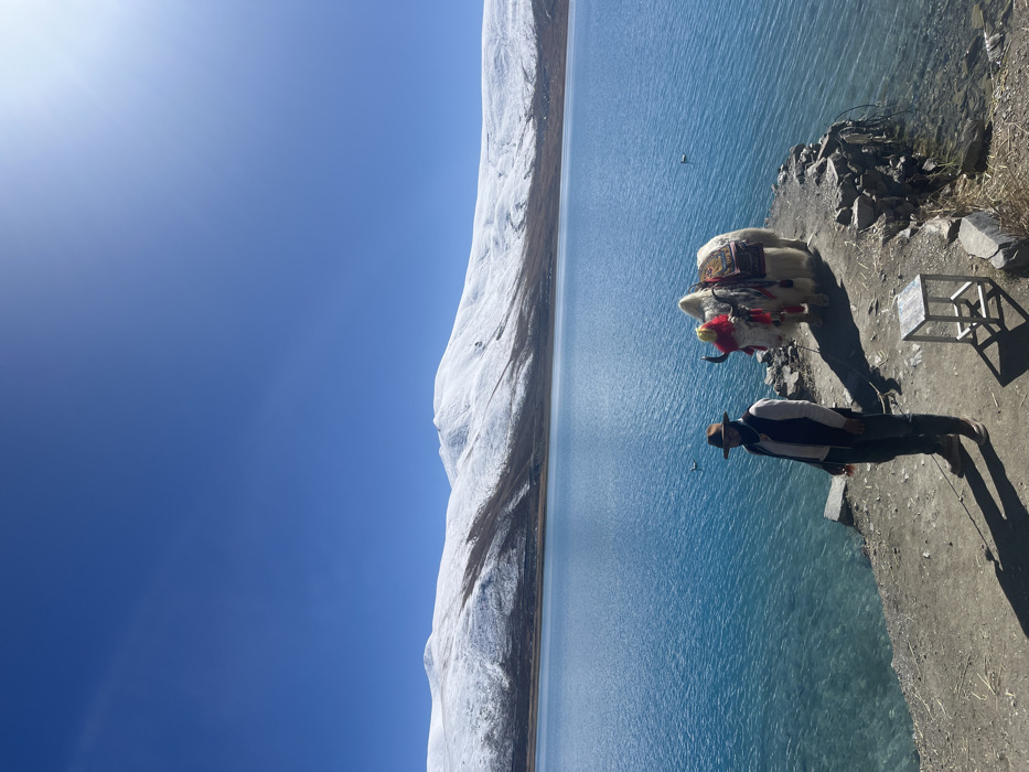A man in a hat stands near a lake alongside a white yak adorned with colorful decorations. The yak is saddled. The clear blue lake is bordered by a steep, snow-covered mountain. The sky is a bright, cloudless blue. A small, white table sits nearby, partially shadowed. The landscape appears arid and mountainous.