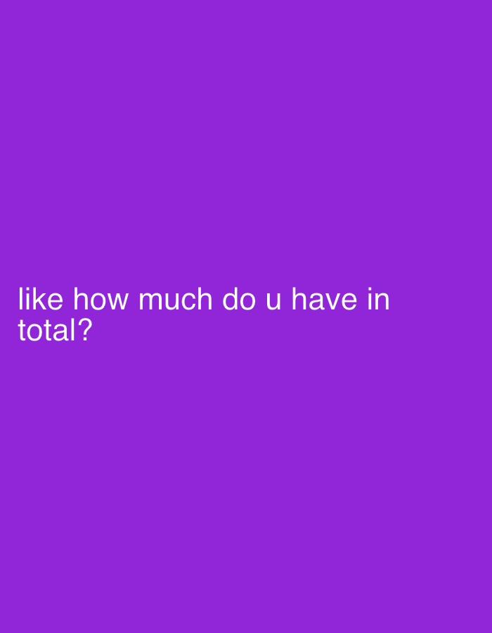 A solid purple background with a message in white font is centered toward the bottom. The message reads "like how much do u have in total?". The text appears to be a question posed in an informal, conversational style. The background is a single, uniform shade of purple.