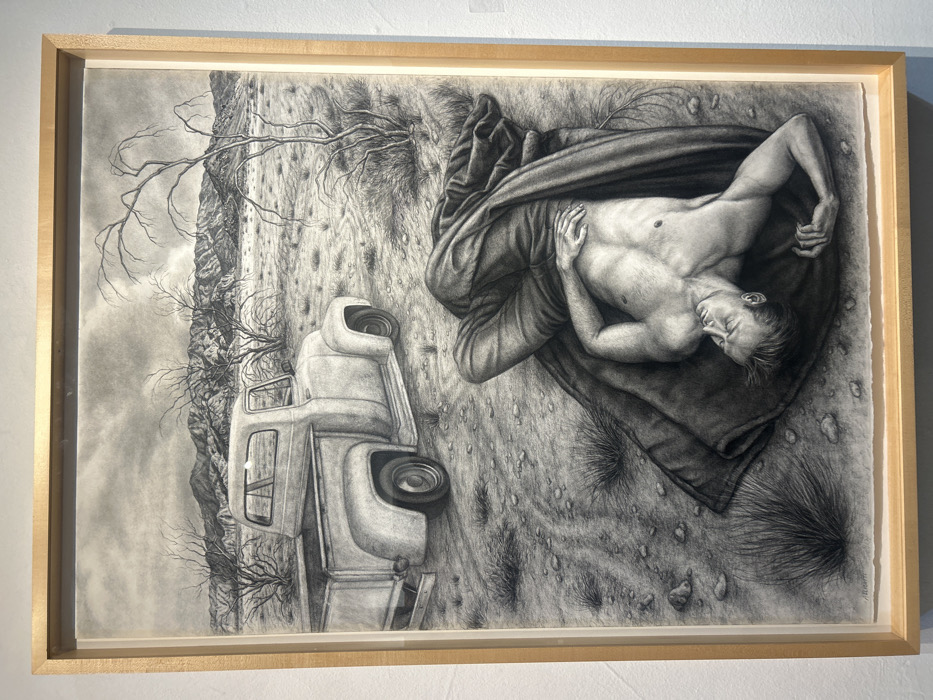 A framed charcoal drawing depicts a man lying on his back partially covered by a dark blanket in a desolate landscape. His face is serene, and his torso is bare. An old pickup truck sits nearby, suggesting a sense of abandonment or isolation. The background features sparse vegetation, mountains, and a cloudy sky. The artwork conveys a feeling of vulnerability and introspection within a harsh environment.