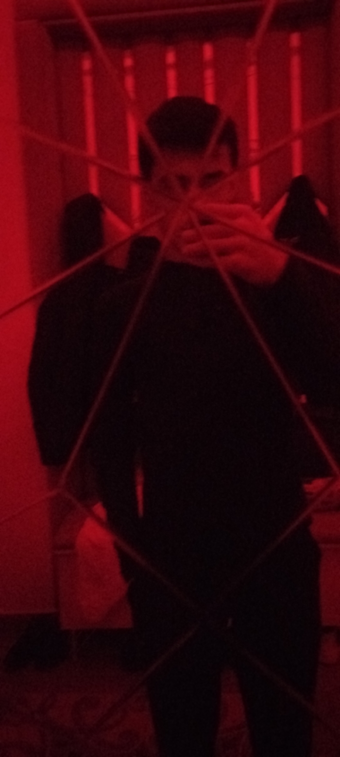 A person stands amidst a web of string or thin rods, silhouetted in stark red lighting. Their face is partially obscured by the web. They are wearing dark clothing and appear to be holding up one hand in front of their face. Behind them, vertical lines are visible, possibly indicating a wall or structure with some kind of paneling or strips. The image has a dark and mysterious aesthetic due to the heavy shadows and monochromatic red color scheme.