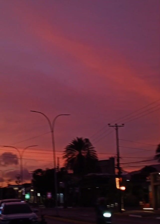 n evening scene on a street. The sky is a vivid mix of pink and purple, indicating either sunset or sunrise. Silhouetted buildings line the street, with a few lighted signs and windows visible. Utility poles with numerous wires crisscross the sky. Cars and motorcycles travel on the road. Streetlights illuminate the scene.