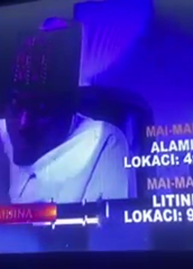 A television screen shows a man in a white outfit and black hat with intricate designs. Text on the screen indicates upcoming shows "Mai-Maici" at 4:00 PM and 9:00 PM. The screen then transitions to a logo animation featuring the words "Tumbin Giwa TV".