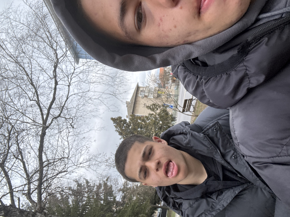 The image displays two young males in an outdoor urban setting in Bansko, Bulgaria, under an overcast sky. The photograph is a close-up, selfie-style composition. The individual positioned on the left side of the frame has short, dark hair, is wearing a black puffer jacket over a black hooded sweatshirt, and is looking towards the camera with their mouth open and tongue extended. The individual on the right, primarily in the immediate foreground, is partially visible, showing only the right side of their face from the nose to the cheek, and their right shoulder. This individual wears a black puffer jacket over a grey hooded sweatshirt. Visible acne is present on the right cheek. Their mouth is slightly open, revealing a portion of the tongue. This individual appears to be operating the camera. The background reveals a street scene with bare deciduous trees dominating the upper section and some evergreen trees on the left. A multi-story building with balconies and a tiled roof is centrally located in the mid-ground. A second building with a blue upper facade is partially visible on the far right. A wooden park bench, a street, and blue street signs are also visible in the background.