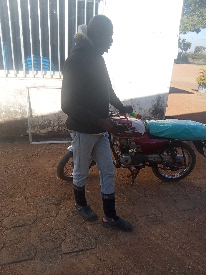 An individual stands next to a red and silver motorcycle in Bar Jirgi Summa, Nigeria