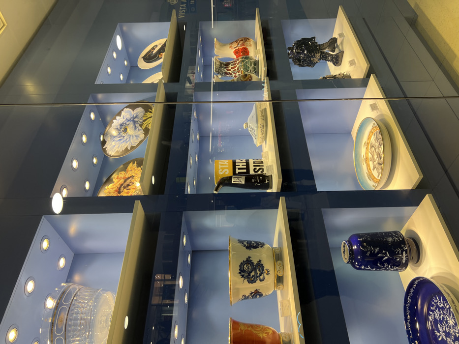 A display cabinet houses an array of porcelain objects in individual, illuminated blue compartments. Vases, plates, and sculptural pieces are featured, showcasing diverse patterns, colors, and designs. Some items are classic porcelain styles, while others appear more contemporary. The objects are displayed on white platforms, adding to the gallery-like aesthetic.
