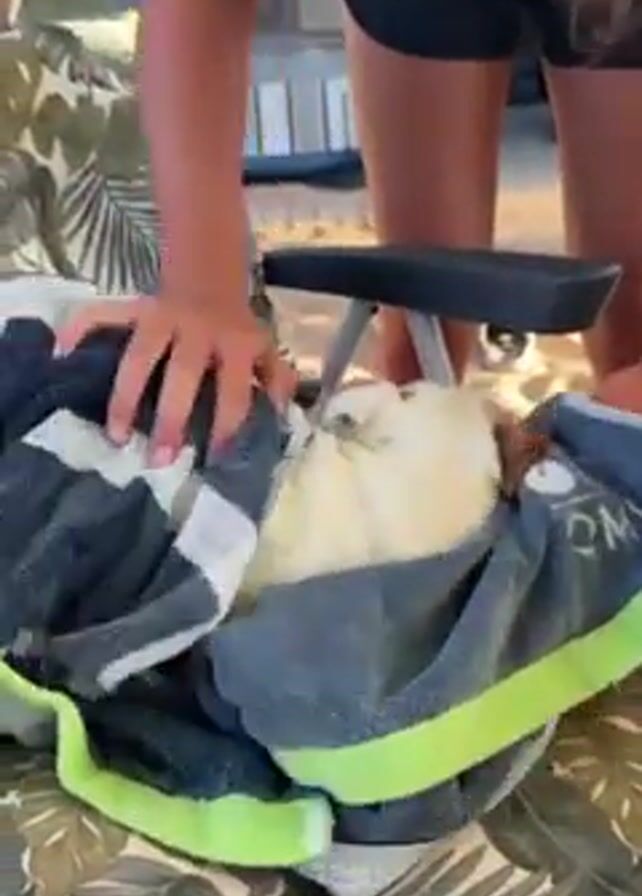 A woman is drying a small, light-colored dog with two towels. The dog is lying down on a chair with a leafy patterned cushion. The woman is standing and using the towels to gently pat and dry the dog. One towel is gray with a neon green trim and the other is white with black stripes. The woman is wearing black shorts. The background is slightly blurred.