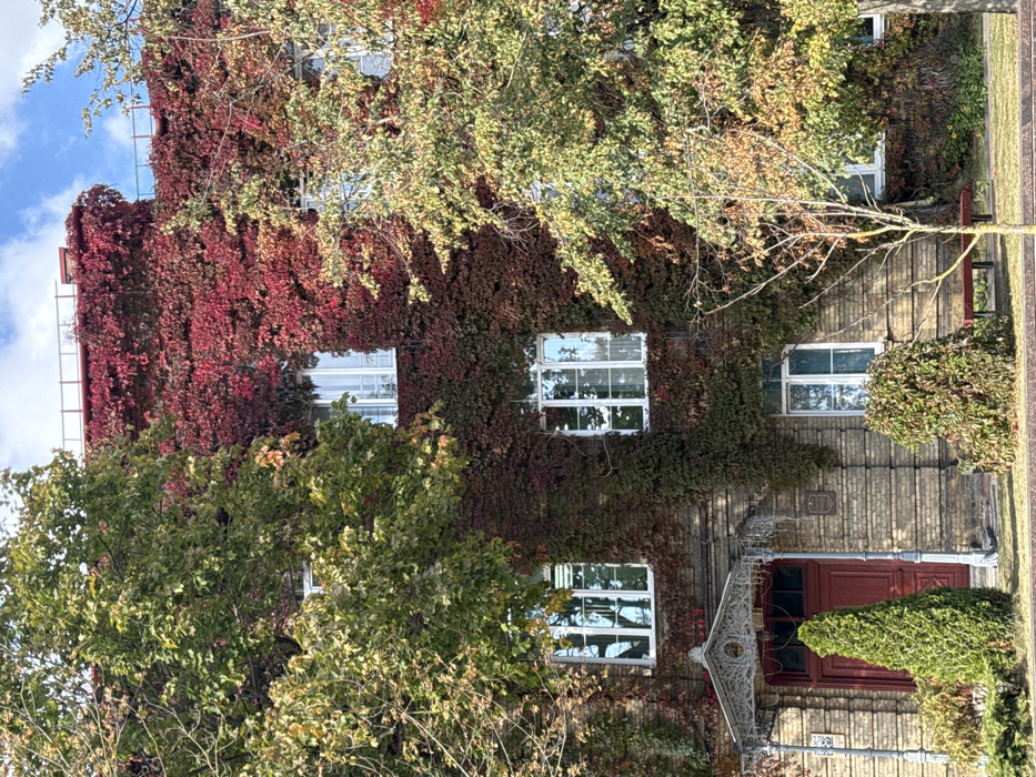 The image depicts the main building of Hrodna State Medical University at vulica Maksima Horaha 80, Hrodna, Belarus. The multi-story brick facade is extensively covered by dense ivy, exhibiting a gradient of autumnal colors ranging from vibrant red at the upper levels to darker maroon and green towards the lower sections. Multiple rectangular windows with white frames and white muntins are visible, reflecting the blue sky and white clouds. The primary entrance features a prominent double red wooden door situated beneath an ornate, light grey metal canopy. Exposed light brown brickwork is visible around the entrance and in areas not covered by ivy. To the left of the entrance stands a conical evergreen shrub. To the right, a low, dense shrub with reddish-green foliage is present. A simple, dark-colored wooden bench is positioned on the grassy area to the right of the entrance. Trees with a mix of green and autumn-colored leaves partially frame the building on both sides, with a thin, bare-branched sapling in the foreground to the right. The scene is illuminated by natural daylight, indicating clear weather. No individuals are present in the image.