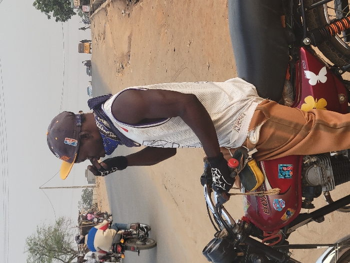 This image captures a street scene in Suleja, Nigeria, under a hazy sky. In the foreground, a young adult male with dark skin is seated on a red motorcycle. He wears a white mesh sleeveless jersey, tan cargo pants, a dark grey baseball cap with a yellow brim and an NBA logo, and black fingerless gloves (the right glove has a white spider web design). A blue and white patterned bandana covers his neck and lower face. His right hand is raised to his nose/mouth area. The red motorcycle features a black seat, "BOXER" text and other stickers on its fuel tank, and yellow and white butterfly decals on its side cover. A yellow and dark green pouch hangs from the handlebars. The unpaved road behind him slopes upward. In the middle distance, another person on a motorcycle, wearing a white, blue, and red top, rides away from the viewer. Further uphill, a yellow motorized rickshaw, other vehicles, and pedestrians are visible. Utility poles with power lines and sparse trees are present along the roadside.