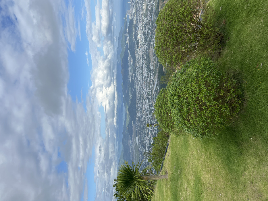 Lush green grass slopes downwards from right to left, punctuated by two rounded bushes. A small palm tree stands near the bottom of the frame. Beyond the grass and trees, a valley stretches out, filled with a dense urban landscape. Mountains rise in the distance, fading into a hazy horizon. The sky is a mix of blue and white, dominated by fluffy, cumulus clouds.