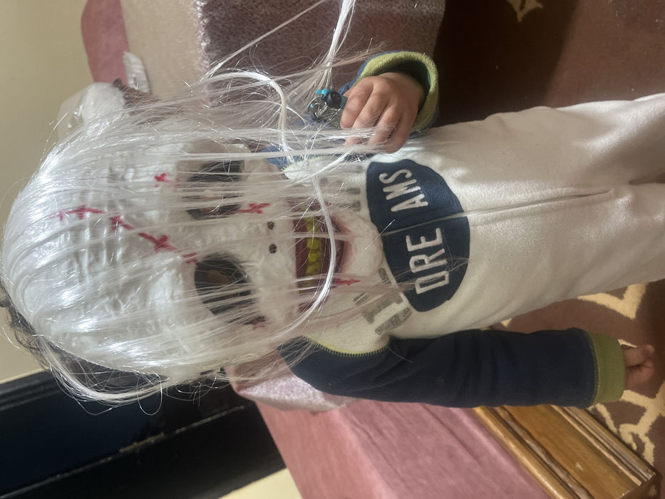 An indoor scene in Ouaouizert, Morocco, features a young child standing and facing the camera directly. The child is wearing a white mask covering the entire head, designed to resemble a ghoul or zombie, complete with red stitch-like markings on the forehead and cheeks, yellow teeth, and long, stringy white synthetic hair. Large, dark eyeholes on the mask reveal the child's eyes. The child is dressed in a white full-body sleepsuit with dark blue sleeves and light green cuffs. A dark blue oval patch displaying the partially visible text "DRE AMS" is situated on the chest. In the child's raised right hand, a small object with blue and silver components is held. The immediate background on the left shows a wooden furniture piece, likely a bed frame, partially covered by a pink textile. Beyond this, a beige wall with a dark vertical element is visible. On the right, another surface is draped with a similar pink textile. The floor beneath the child consists of a patterned rug on the left and a darker, solid-colored surface on the right.