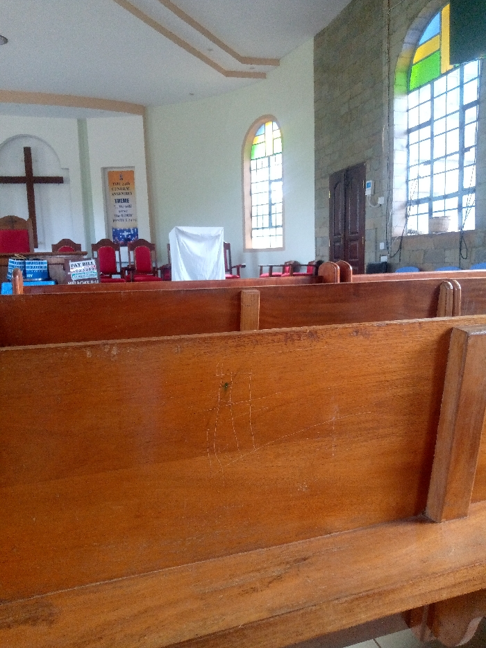 A church interior showcases wooden pews with visible wear. At the front, a wooden cross stands on a wall above red-cushioned seats. Natural light streams through stained-glass windows. A banner with text sits beside a white-draped object, with open space around the seating area. A door is visible in the background. The overall aesthetic suggests a traditional, serene place of worship.