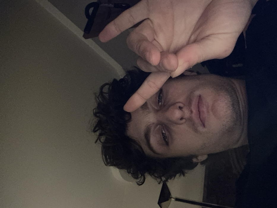 A dimly lit, close-up image taken indoors in Vincennes, France, features a male individual positioned centrally, looking directly into the camera. The subject has dark, curly hair, light-colored eyes, and light facial stubble. He is wearing a dark-colored top. His right hand is raised to the upper right side of his head, forming a gesture with the index and pinky fingers extended, while the thumb secures the middle and ring fingers. In the background, to the left, a portion of a lamp with a metallic base and a dark shade is visible. To the right, an indistinct dark object, possibly furniture, with a strap or handle, is partially visible against a muted, light-colored wall or ceiling.