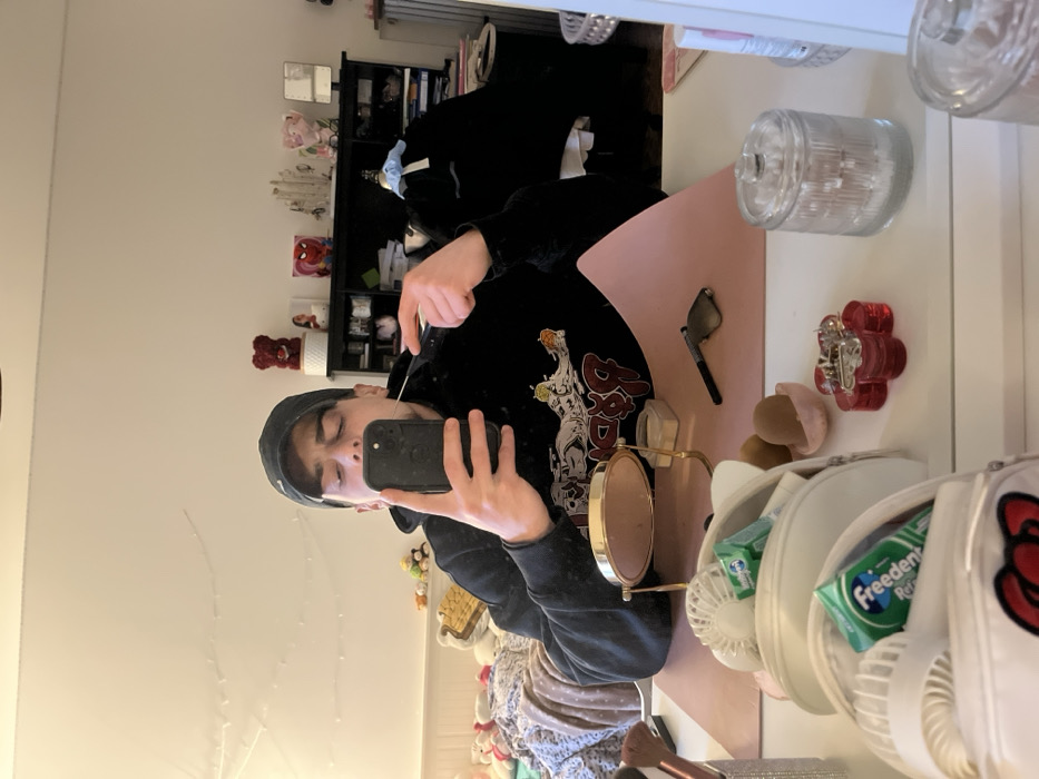 A person wearing a black hoodie and a black baseball cap takes a mirror selfie. The background includes a shelf with various items and a desk. The desk contains cosmetic items and storage solutions like jars and organizers filled with makeup and accessories. Light is reflected in the mirror, creating a few vertical streaks on the left side. The phone being held is black.