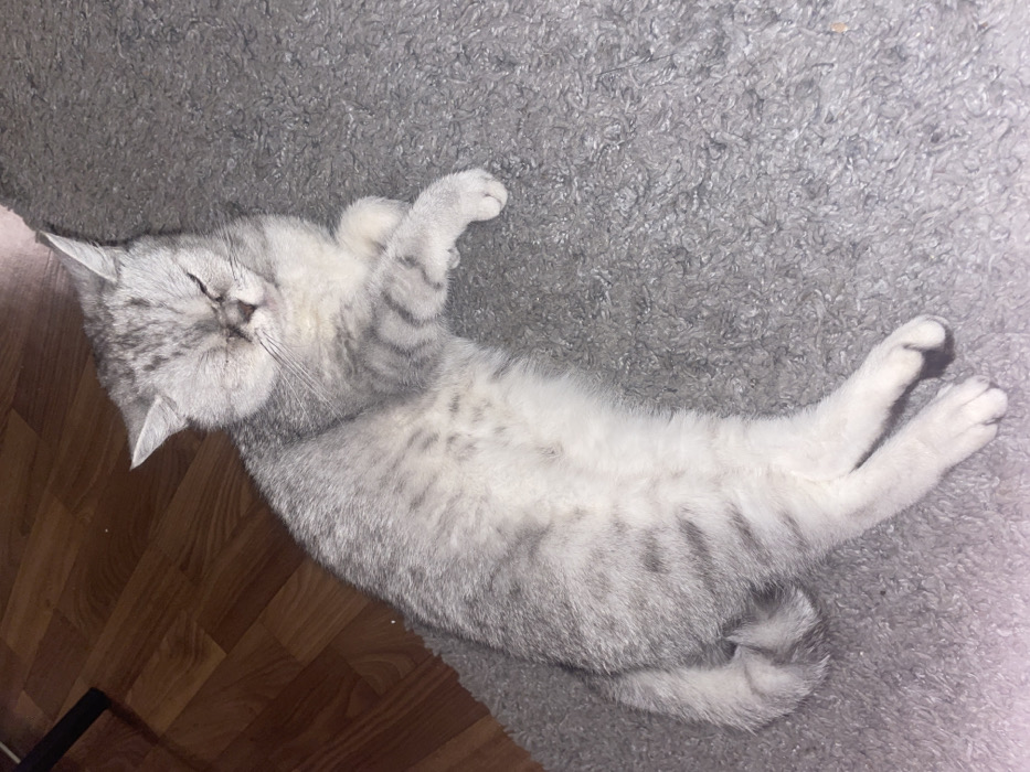 - "A silver tabby cat sleeps on a gray rug" by FM-aSc183, licensed under CC BY 4.0