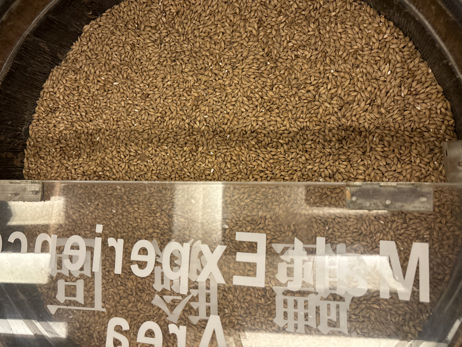 - "An overhead view depicts a large quantity of light brown, ovoid grains, consistent with malted barley, contained within a dark, circular receptacle or bin" by FM-bmo3E3, licensed under CC BY 4.0