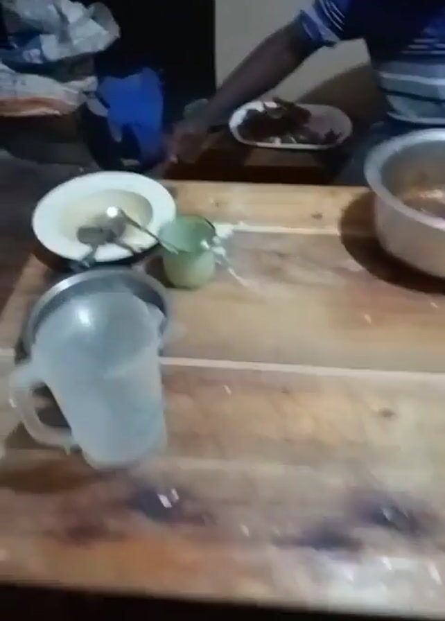 A man is preparing a meal in a dimly lit indoor setting. He is wearing a striped blue and white shirt. Several plates, bowls, cups and cooking utensils are scattered on a wooden table. The man uses a spoon to transfer a liquid, possibly a sauce, from a pot to a white plate. A separate plate holds what appears to be cooked meat. The environment seems like a kitchen or dining area.