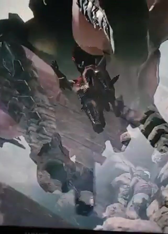 A video shows a computer screen displaying a character in a video game. The character is dressed in a red and black outfit with elaborate armor and has red hair styled in a mohawk. The character is jumping off a stone structure and lands on a platform, then faces another character in armor. The background is blurry but appears to be an outdoor environment. The TV is a Samsung.