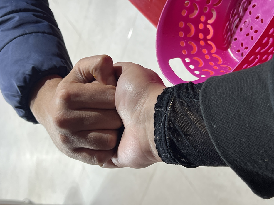 Two hands are clasped together in a tight grip. One hand is pale, with a blue sleeve partially visible. The other hand has a dark, mesh-like covering at the wrist, transitioning to a solid dark fabric. A red and pink plastic basket is slightly visible in the upper right. The background appears to be a light, smooth surface, possibly a table or floor.
