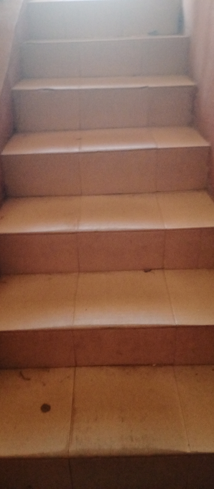 A straight staircase ascends, tiled with a light brown material. The tiles are rectangular and appear to be set on each step. The lighting is soft, creating gentle shadows that accentuate the edges of each step. The bottom step has a dark mark or stain. The staircase is framed by a wall or a building element on both sides, visible only slightly. The upper steps are lighter, possibly due to increased light exposure.