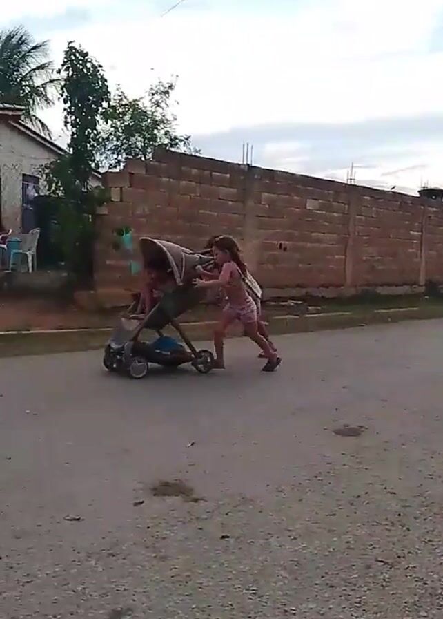 The video depicts two young girls running down a street, pushing a baby stroller
