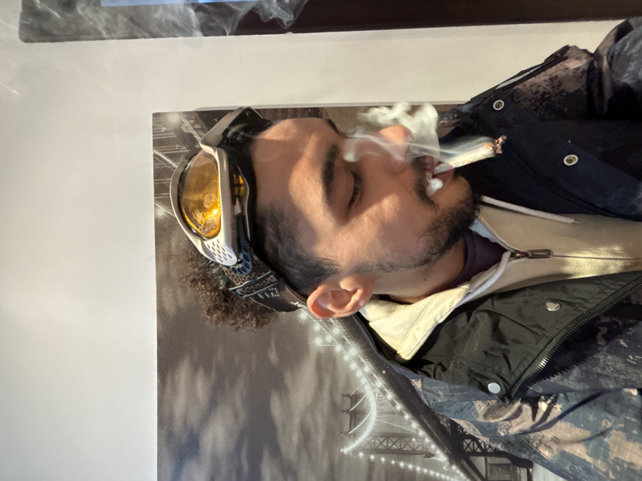 A young adult male is depicted in a close-up, chest-up vertical photograph in M'Diq, Morocco. He has short dark curly hair on top, faded sides, a beard, and a mustache. A pair of white and grey goggles with amber-tinted lenses and a patterned strap are pushed up onto his forehead. He is wearing a dark, patterned jacket over a light-colored, possibly beige, zippered hoodie, with a purple garment visible beneath the hoodie. A hand-rolled cigarette or joint is held in his mouth, actively burning at the tip and emitting a plume of white smoke that obscures parts of his mouth and nose. His eyes appear downcast or closed. The background features a large black and white photographic print of a suspension bridge with lights, visible on a wall.