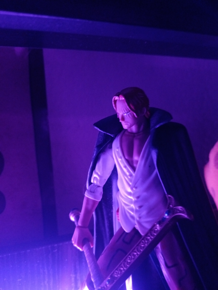 A figurine of the character Shanks from One Piece stands in a purple-lit display