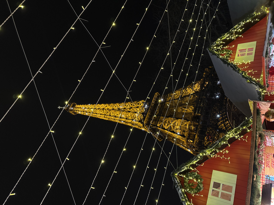 Illuminated Eiffel Tower at night, viewed from a low angle. A web of string lights with small bulbs extends across the dark sky. To the right, a glimpse of a Christmas market stall decorated with garlands and a small wreath. The stall's red and green colors contrast with the golden glow of the tower and the dark sky. The image is rotated counter-clockwise.