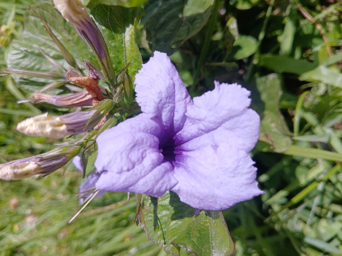 A vibrant, lavender Ruellia simplex flower dominates the frame. It has five petals and a dark purple center. To the left, clustered buds transition from ivory to faded purple. Green leaves provide a backdrop, while blades of grass fill the surrounding space. The scene is bathed in natural light, highlighting the flower's texture and colors.