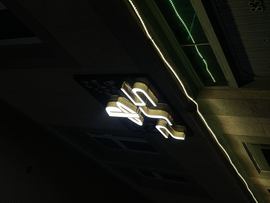 The image depicts the exterior of a building at night in Karmana, Uzbekistan. A prominent, illuminated white neon sign forming the "PS5" logo is mounted on the upper portion of a light-colored, textured building facade. To the left of this sign, a smaller, dark rectangular board featuring multiple white outlines resembling game controllers is visible. Below the main sign, a string of white LED rope lights extends horizontally across the facade, illuminating the surface directly beneath it. Below these lights, a row of dark windows reflects segments of green light. In the lower right corner, the building number "83" is faintly visible on the facade, adjacent to a dark, shuttered window or door. The scene is devoid of people.