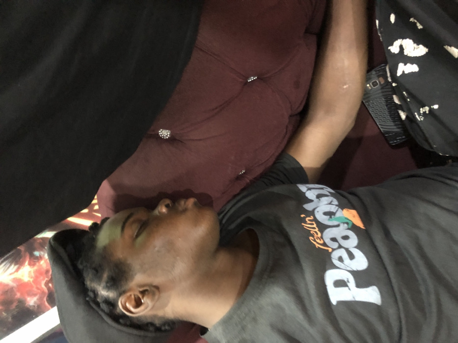 A single individual is depicted lying on a dark red tufted sofa, at a specified location in Adankolo, Nigeria. The individual, an adult with dark skin and braided hair styled under a dark cap, presents with closed eyes. They are dressed in a dark grey t-shirt featuring the text "Feelin' Peachy" and a peach graphic on the chest, paired with black trousers patterned with white or light-colored shapes. A dark-colored smartphone with a textured case is visible next to the individual's right forearm, resting on their leg area. The sofa is upholstered in dark red fabric with crystal-like button tufting. The upper left background reveals a segment of a reddish-orange image or artwork, while a dark, possibly fabric, element obscures the upper right background.