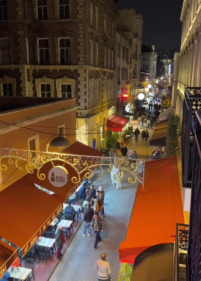 Here's a detailed description of the video: The video shows a narrow, busy street in what appears to be a European city at night. The view is taken from an elevated position, possibly a balcony or upper-story window, looking down the street. Several restaurants with outdoor seating areas line both sides of the street, each covered by awnings, primarily red in color. Tables and chairs are visible, some occupied by people. Numerous people are walking along the street, both individually and in groups. They are dressed in casual clothing, suitable for nighttime. The street is adorned with decorative lighting, including strings of lights in ornate patterns hung above the street. These lights add to the festive atmosphere. Buildings on either side of the street are multi-storied, constructed of stone or brick, with visible architectural details. The buildings are lit, casting a warm glow on the scene. There is moderate foot traffic on the street, with people walking in both directions, going about their evening. Overall, the scene is lively and inviting.