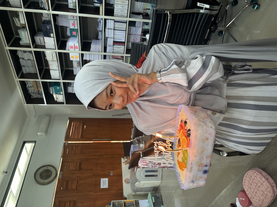 A woman wearing a gray hijab and striped shirt makes a peace sign while holding a cake with fruit and a "Happy Birthday Felicia" topper. Shelves filled with files and binders line the wall in the background. There is a clock on the wall and a wooden door. A black office chair is visible. Other objects on a table include a pink purse and a red object.