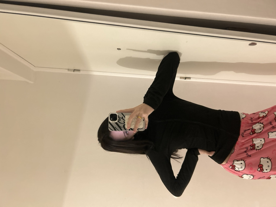 A person takes a mirror selfie. She is wearing a black, long-sleeved jacket and pink pajama pants with a Hello Kitty print. Her phone has a zebra-striped case. The background consists of a white wall and a white door frame above the mirror. The photo is slightly rotated, and the lighting appears artificial, casting shadows above her.