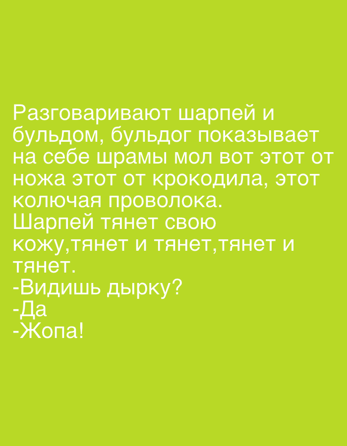 The image contains text in Russian on a green background. The text is a joke involving a Sharpei and a Bulldog. The Bulldog shows off his scars from a knife, crocodile, and barbed wire. The Sharpei stretches his skin and asks if the Bulldog sees a hole. The Bulldog says yes and the Sharpei replies "Ass!".