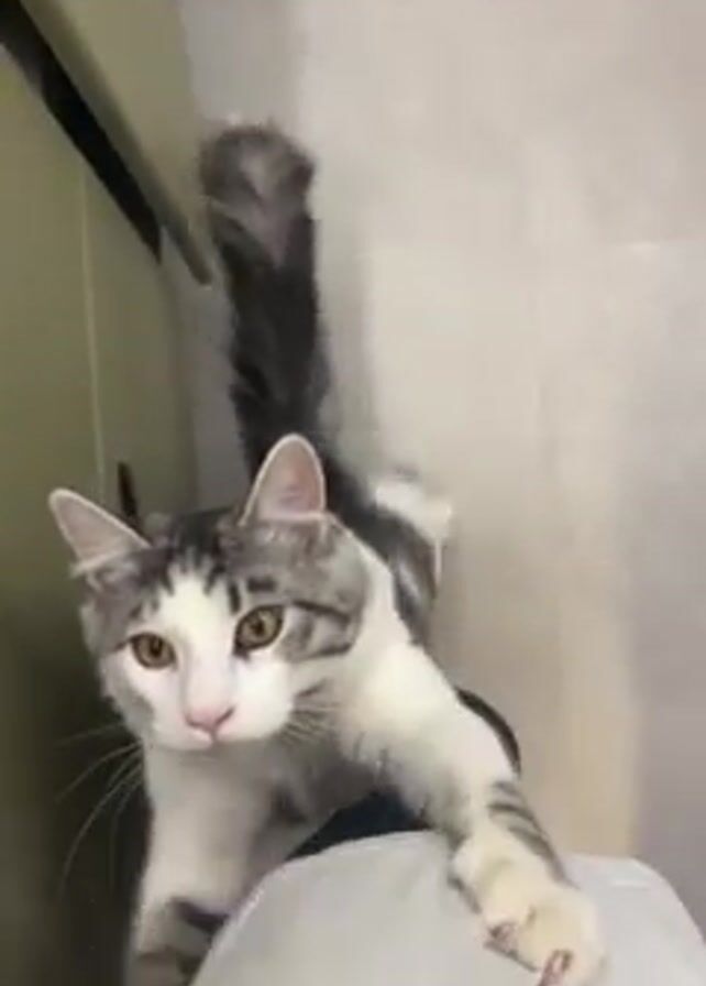 A close-up shot shows a white and gray tabby cat, with its tail straight up, standing on a surface covered with white material