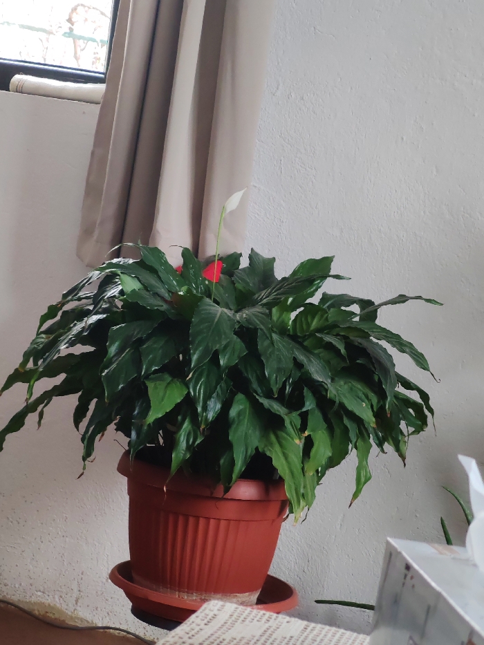 The scene depicts an interior setting in Kableshkovo, Bulgaria. A large, green potted plant, identified as a Spathiphyllum (Peace Lily), is centrally positioned. The plant features numerous dark green, glossy leaves and one prominent white spathe with a spadix extending upward. A small, red, circular object is partially visible within the plant's foliage, behind the white flower. The plant is contained within a ribbed, terracotta-colored plastic pot, which sits on a matching saucer. To the left, a window with a dark frame is partially visible, obscured by a light-beige curtain or roller blind. The background wall on the right is textured and light-colored. In the lower right foreground, a white tissue box with a floral or patterned design is partially visible, along with a slender green succulent plant. A light-colored, patterned textile is present beneath the plant pot. No individuals are depicted.