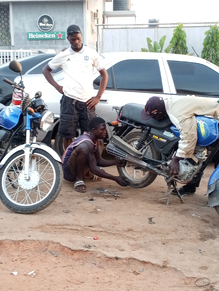 - "The image depicts an outdoor motorcycle repair scene on unpaved reddish-brown dirt in Narayi, Nigeria" by FM-ylUny1, licensed under CC BY 4.0
