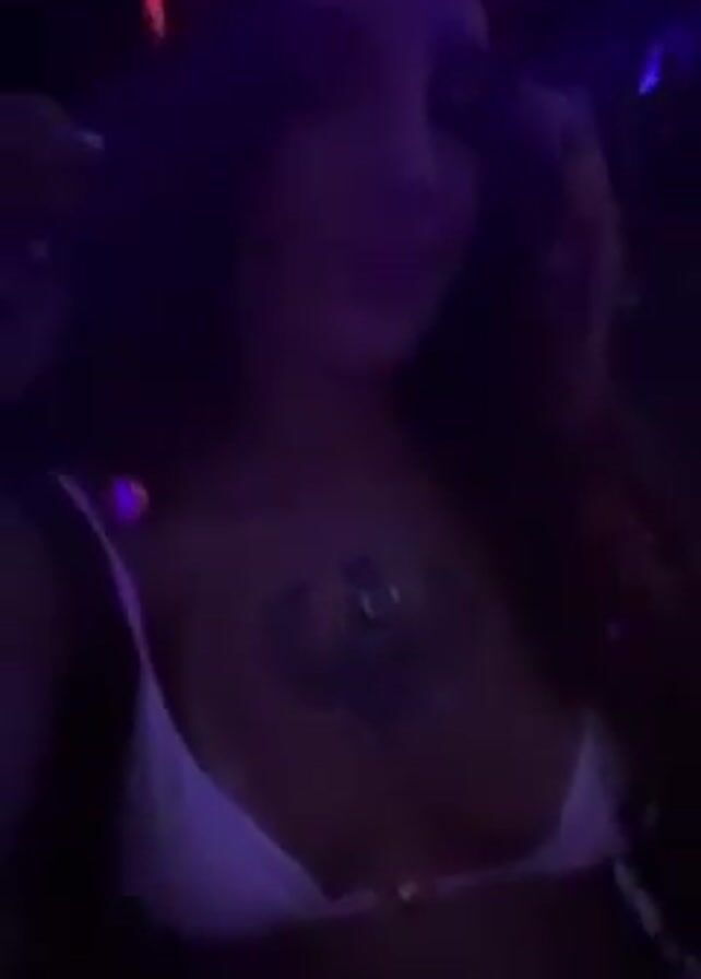 woman with long brown hair and a red hat standing in a dimly lit environment, possibly a club. She is wearing a white bikini top and has a visible tattoo on her chest. The lighting is primarily blue and purple, creating a vibrant atmosphere. Other people can be seen in the background, some dancing or moving around. The woman is looking at the camera and smiling, occasionally making a kissing face. Loud music plays in the background.