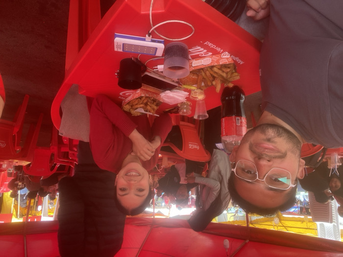 The image displays two individuals seated at a red plastic table beneath a red overhead canopy, characteristic of an informal outdoor or semi-outdoor dining establishment within the city of La Paz, Bolivia. The male subject on the left, positioned closer to the viewer, has a short beard and clear-framed eyeglasses, wearing a dark short-sleeved shirt. He is looking directly at the camera with a subtle smile. To his right, a female subject with visible dental braces is seated, wearing a long-sleeved red top, also looking directly at the camera with a smile and her hands clasped. On the red table, a partially full 3-liter Coca-Cola bottle is centrally placed. Two rectangular cardboard trays contain servings of french fries and other fried items, one with a small white plastic fork and a cup of sauce. A clear plastic cup holds a dark beverage with ice. Additional items on the table include a white power bank connected via a white cable, a black cylindrical object, and a coiled white cable. The floor beneath the table is dark. In the background, multiple red plastic tables and chairs are visible, some occupied by indistinct figures. A person in a light-colored top is standing in the mid-ground. Sections of a yellow canopy are visible further in the distance, indicating a larger covered area. The scene depicts a casual food court or market environment.