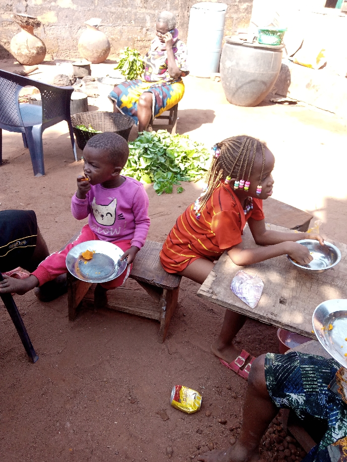 The image depicts an outdoor scene in Okpatu-Ukehe, Nigeria, featuring three individuals and various domestic objects under bright sunlight. In the foreground, two young children are seated on low wooden stools, actively eating. The child on the left, wearing a pink long-sleeve shirt with a cat graphic and red pants, holds a metal plate with orange food residue and consumes an orange food item. The child on the right, with braided hair adorned with colorful beads, wears an orange striped shirt and shorts, and is seen with hands inside a metal bowl on a low wooden table. An elderly person with grey hair, dressed in a patterned top and wrapper, is seated on a wooden stool in the mid-ground, speaking on a mobile phone to their right ear. The ground consists of reddish-brown dirt. A pile of green leafy vegetables lies on the ground, with more in a dark woven basket. Several large clay pots are visible in the background against a light brown brick wall. Other objects include a black plastic chair, a light blue barrel, a small green plastic container, and a crumpled yellow "Seltzer" brand can on the ground. A white and purple striped object rests on the wooden table.