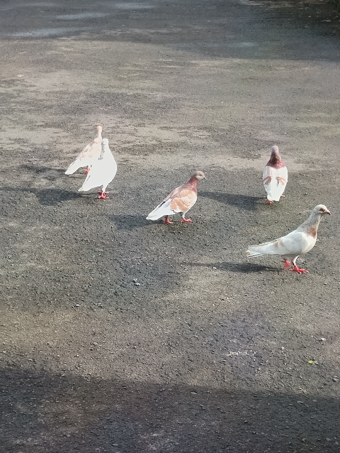 Four pigeons stand on a paved surface. One is white with reddish-brown patches. A second has brownish-red plumage with some white. Another faces away, primarily brown and white. The fourth pigeon appears gray and white. All four stand with their reddish-orange feet visible. The pavement is dark with patches of sunlight.