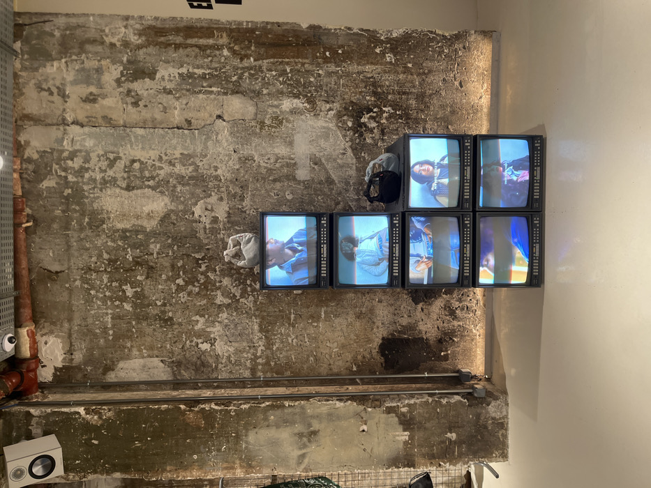 The image displays an interior scene, likely a commercial or exhibition space, located in Paris, France. The environment features a dominant, heavily textured, exposed concrete wall, characterized by areas of wear, discoloration, and visible cracks. The floor is a smooth, reflective light-grey or off-white surface. Overhead, red industrial piping, a grey metallic cable tray, a white wall-mounted speaker, and a small white security camera are visible. A central art installation or display comprises six vintage-style, black-cased cathode-ray tube (CRT) televisions. These televisions are arranged against the concrete wall in a descending, stepped formation from the top-left to the bottom-right. A vertical stack of three televisions forms the leftmost column. To its right, a second vertical stack of three televisions is positioned lower, with its topmost unit approximately level with the middle television of the left stack, creating a distinct visual descent. Each television screen is actively displaying video content, predominantly featuring individuals (models) in various fashion-oriented or casual attire. The visuals are vibrant, with some screens exhibiting horizontal line interference or other video artifacts. Two small objects are placed on the televisions: * A light grey, soft, bundled fabric item, possibly a small bag or pouch, rests on the top-left television. * A small, black, structured handbag is placed on the topmost television of the right-hand stack. To the far left of the frame, a metal grid structure is partially visible, from which dark fabric items appear to be hanging. A single white shoe is present on the floor in the bottom-left corner. On the far right, a section of a smooth white wall bears partially obscured black text. No live individuals are present in the immediate scene.