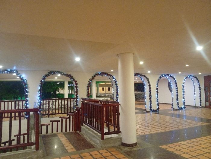 A building interior features a staircase with brown railings leading downwards. The architecture showcases arches adorned with garland and twinkling lights. A white pillar supports the ceiling. The floor is tiled in earth tones. The arches lead to different spaces, possibly outdoors or other rooms. The scene evokes a festive or celebratory atmosphere.