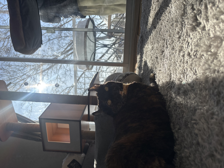 A tortoiseshell cat sits on a gray couch next to a fuzzy, light gray carpet. The cat faces the viewer with curious eyes. A cat tree with a square house and sisal-covered posts stands next to the couch. In the background, a bright window reveals a clear, sunny sky and bare tree branches. Sunlight filters through the window, creating highlights and shadows.