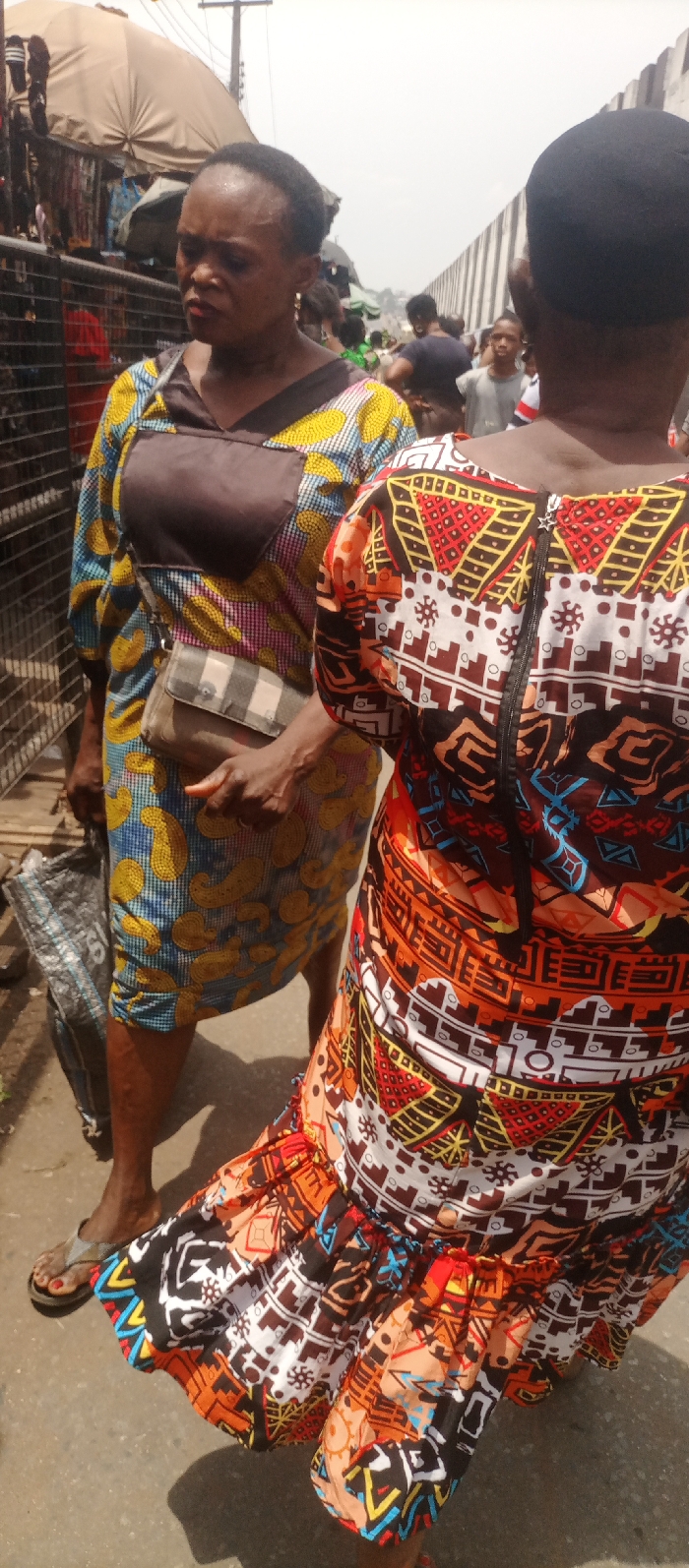 The image depicts a daytime scene in a crowded urban environment, identified as the city of Nkpor, Nigeria, likely a market area. In the foreground, two adult women are partially visible. The woman on the left, facing slightly right and looking downwards, has dark skin and short dark hair. She wears a long-sleeved dress featuring blue and yellow patterns, with a brown V-neck insert. A small, checkered brown and white crossbody bag hangs from her left shoulder, and her left hand holds a dark, woven bag. She wears light-colored flip-flops. The woman on the right is seen from behind, with the back of her head and body visible. She has short dark hair and wears a long-sleeved dress with multiple vibrant, geometric patterns in red, orange, brown, white, and blue. A black zipper with a star-shaped pull is visible vertically down the back of her dress. The lower portion of her dress features a ruffled hem. In the background, numerous additional individuals, including adults and children, are present, indicating a densely populated public space. To the far left, a light-colored market umbrella or awning is visible above a dark metal fence or grating. A tall, light-colored concrete wall extends along the right side of the frame into the background. The ground appears to be paved, and the sky is bright, suggesting an outdoor setting under daylight conditions.