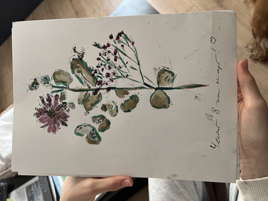 A pair of human hands holds a vertically oriented white sheet of paper featuring a botanical artwork. The artwork, rendered with what appears to be watercolor or tempera, depicts a large purple multi-petaled flower with irregular green and brown leaves on the left, and a slender green stem branching into smaller sections with clusters of tiny red berry-like elements on the right. Below the artwork, handwritten in black Cyrillic script, is the phrase "Честит 8 ми март!" (Happy 8th of March!), followed by an exclamation mark and a small heart symbol. The paper exhibits scattered smudges around the artwork and text. In the blurred background, an electronic device, possibly a laptop, and a white container are visible on a light surface in the upper left quadrant. A blurred section of a light brown furry animal, likely a dog, is visible on a wooden floor in the lower right quadrant. The scene is located within a domestic interior in Sofia, Bulgaria.