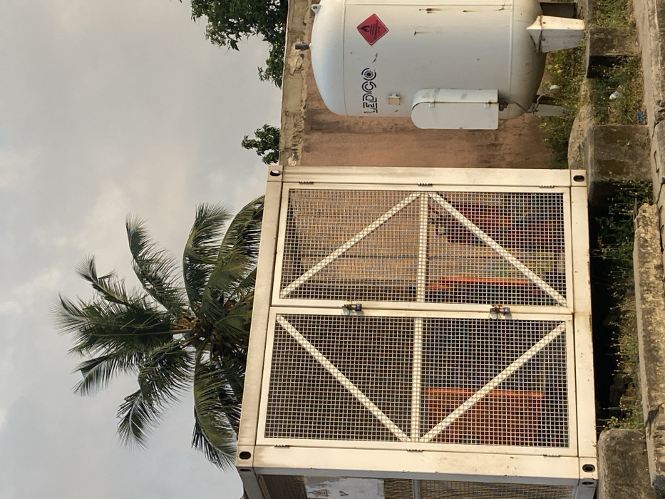 A white, fenced cage-like structure with a white gas tank on top sits outside. The fence has a symmetrical cross design on its side. The tank is round, with a red warning symbol on its side. A lush green palm tree is seen partially obscured by the fence. Vegetation grows near the fence and the sky is cloudy and overcast.