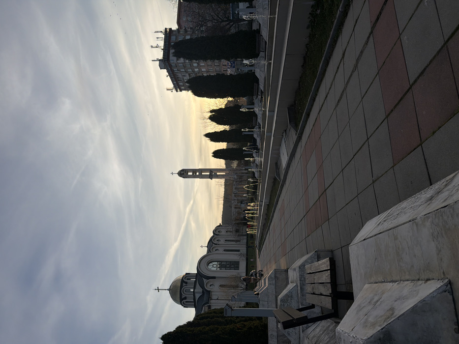 The image depicts an outdoor public area in Montana, Bulgaria, during late afternoon or early evening. The prominent structure on the left is the St. George the Victorious Cathedral, an Orthodox church characterized by a golden dome topped with a cross. Adjacent to it stands a tall, slender bell tower, also surmounted by a cross. A checkered paved walkway, composed of grey and reddish-brown square tiles, extends from the foreground towards the background. Parallel to the walkway, a linear water feature contains multiple illuminated fountains, some actively spouting water, within a basin. Tall, dark evergreen trees are planted along this water feature and near the cathedral. In the far right background, a multi-story building with various antennas on its roof is partially visible. One individual is observed pushing a stroller on the paved area to the left, near the cathedral. The foreground includes concrete benches with wooden slats. The sky displays a gradient from light blue overhead to a warm yellowish-orange at the horizon, featuring visible cirrus cloud formations and faint contrails.